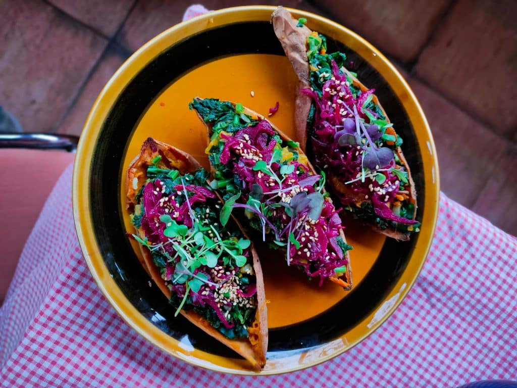 - Boniatos asados con limón rellenos de hojas verdes y chucrut de lombarda